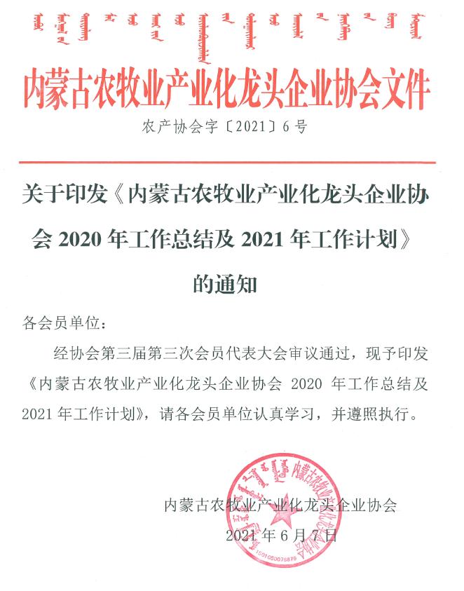 標(biāo)題:關(guān)于印發(fā)《內(nèi)蒙古農(nóng)牧業(yè)產(chǎn)業(yè)化龍頭企業(yè)協(xié)會(huì)2020年工作總結(jié)及2021年工作計(jì)劃》的通知