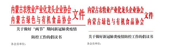 一、內(nèi)蒙古農(nóng)牧業(yè)產(chǎn)業(yè)化龍頭企業(yè)協(xié)會(huì)聯(lián)合內(nèi)蒙古綠色與有機(jī)食品協(xié)會(huì),先后發(fā)布了《關(guān)于做好“兩節(jié)”期間新冠肺炎疫情防控工作的倡議書》和《關(guān)于做好新冠肺炎疫情防控工作的倡議書》,引導(dǎo)各會(huì)員單位堅(jiān)決遏止借機(jī)囤積居奇、哄抬物價(jià)、虛假宣傳等破壞市場(chǎng)秩序、損害消費(fèi)者合法權(quán)益的不法行為,堅(jiān)決遏制疫情擴(kuò)展蔓延,積極投身新型冠狀病毒防控戰(zhàn)役中。