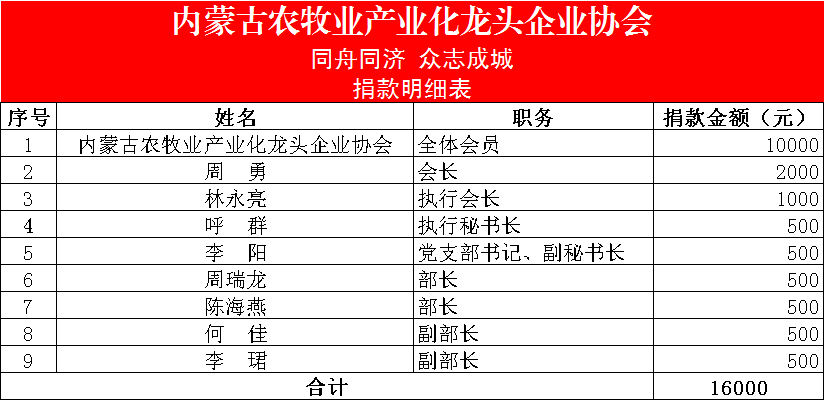 三、“一方有難,八方支援”,截止目前,在協(xié)會(huì)會(huì)長(zhǎng)周勇的帶領(lǐng)下,協(xié)會(huì)秘書處共募集抗疫捐款1.6萬元,結(jié)合地方所需,已于2月23日以現(xiàn)款形式捐贈(zèng)給呼和浩特市紅十字會(huì),用于呼和浩特市疫情防控工作。