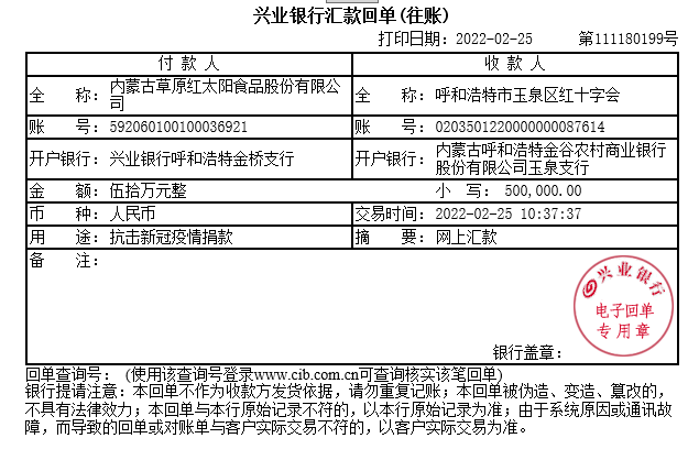 18、會(huì)員單位-內(nèi)蒙古草原紅太陽食品股份有限公司:2022年2月25日,紅太陽公司向呼和浩特市紅十字會(huì)捐款50萬元,用于抗擊新冠疫情。