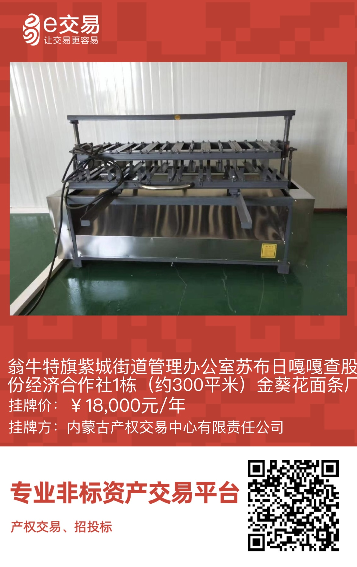 翁牛特旗紫城街道管理辦公室蘇布日嘎嘎查股份經(jīng)濟(jì)合作社1棟(約300平米)金葵花面條廠廠房及設(shè)備出租(租金18000元/年,租期5年)