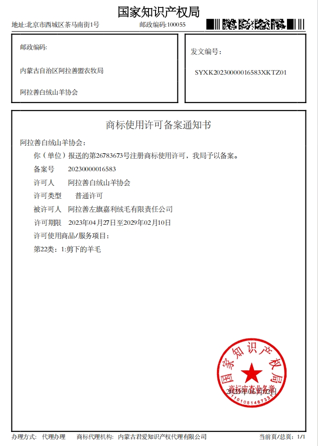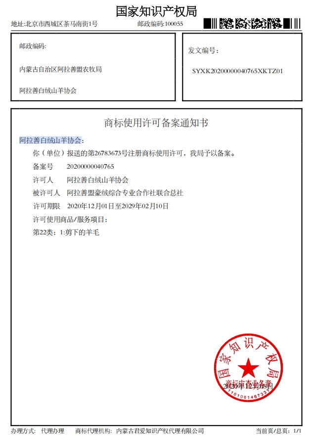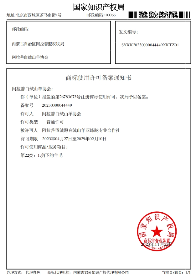 阿拉善白絨山羊協(xié)會(huì)已收到國(guó)家知識(shí)產(chǎn)權(quán)局下發(fā)的4項(xiàng)商標(biāo)使用許可備案通知書(shū)