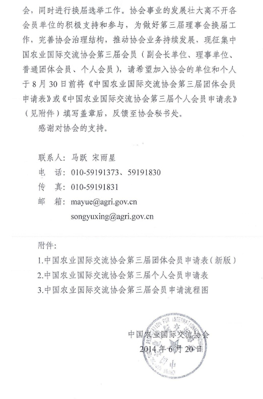 轉發(fā)關于征集中國農業(yè)國際交流協(xié)會第三屆會員的函