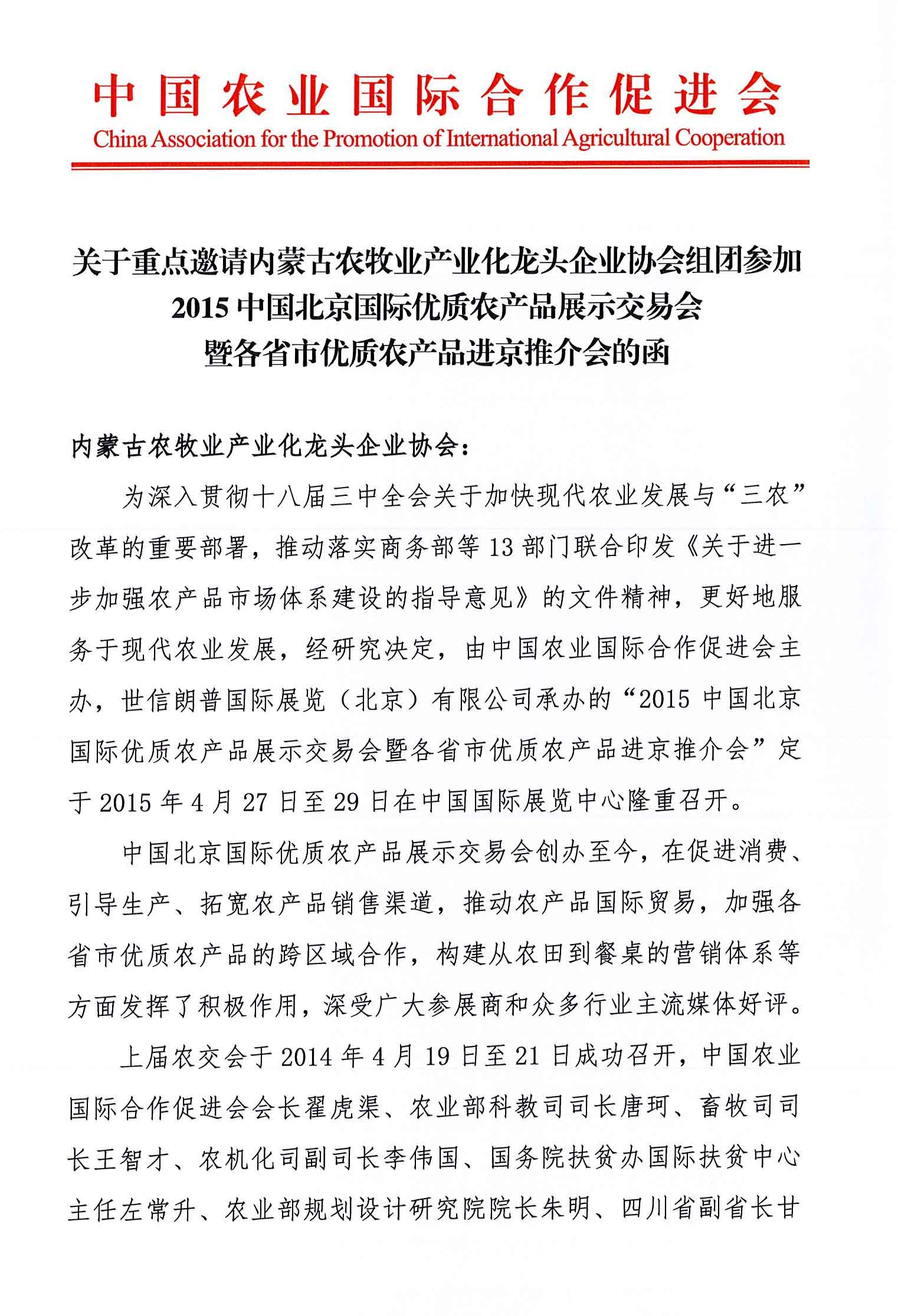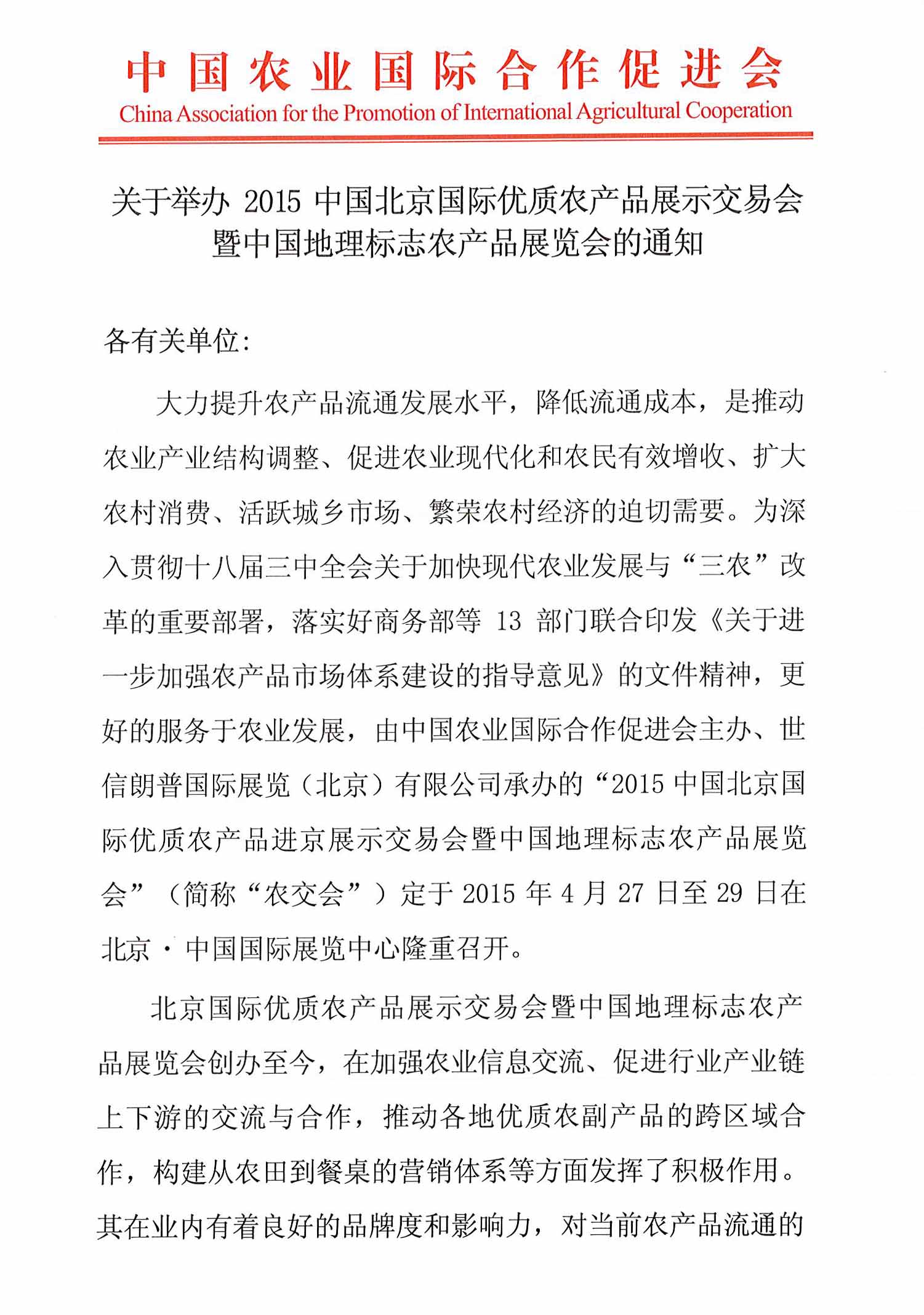 關(guān)于組織會員企業(yè)參加2015中國北京國際優(yōu)質(zhì)農(nóng)產(chǎn)品展示交易會暨各省市優(yōu)質(zhì)農(nóng)產(chǎn)品進(jìn)京推介會的通知