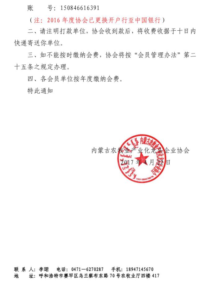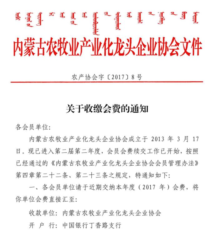 關(guān)于收繳會費的通知【2017】8號