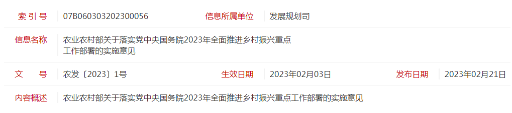 標(biāo)題:農(nóng)發(fā)〔2023〕1號農(nóng)業(yè)農(nóng)村部關(guān)于落實(shí)黨中央國務(wù)院2023年全面推進(jìn)鄉(xiāng)村振興重點(diǎn)工作部署的實(shí)施意見