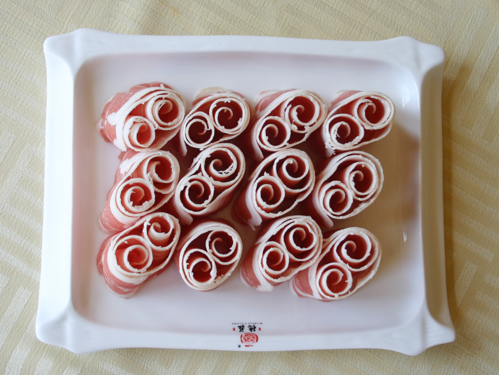 十五、全羊卷:選用原料:精選后的上腦、前腿、后腿,按肉紋方向一致、肥瘦搭配均勻,卷制而成。適合涮。注:該產(chǎn)品沒有去云皮。