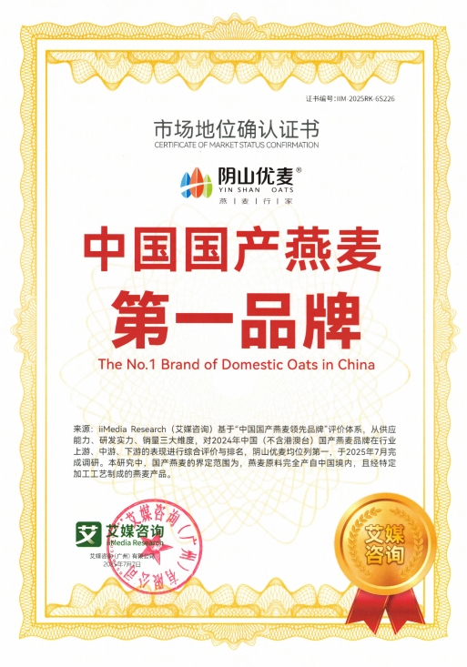 2025年7月,內(nèi)蒙古陰山優(yōu)麥食品有限公司獲得權(quán)威咨詢機構(gòu)艾媒咨詢(iiMedia Research)頒發(fā)的“全球裸燕麥第一品牌”與“中國國產(chǎn)燕麥第一品牌”市場地位確認證書。同時,其創(chuàng)新產(chǎn)品“低GI五黑燕麥片”亦被權(quán)威認證為全球開創(chuàng)者,標志著陰山優(yōu)麥在全球燕麥行業(yè)取得突破性成果。